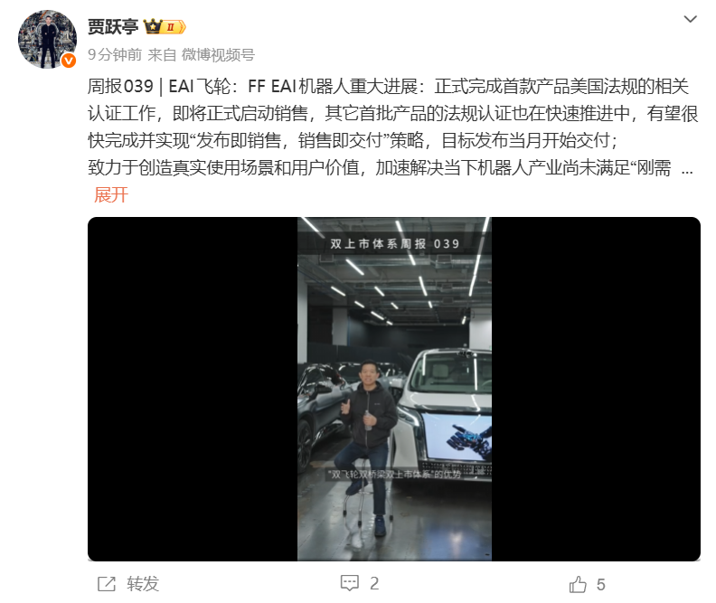 FF创始人、合伙人贾跃亭今日发文宣布,FF EAI机器人重大进展。正式完成首款产品美国法规的相关认证工作,即将正式启动销售,其它首批产品的法规认证也在快速推进中,有望很快完成并实现“发布即销售,销售即交付”策略,目标发布当月开始交付。