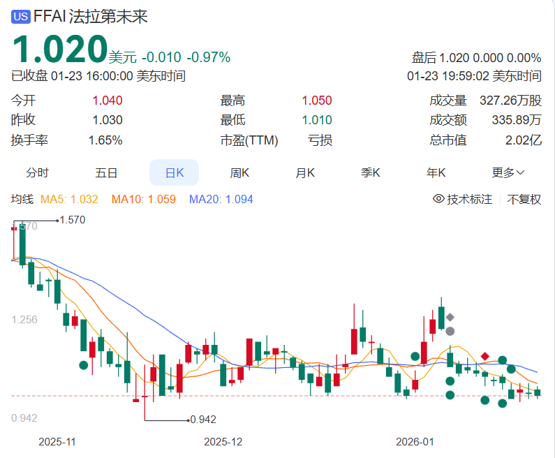 据了解,法拉第未来FFAI当前股价为1.02美元,总市值为2.02亿美元,股价已经逼近1美元退市线。