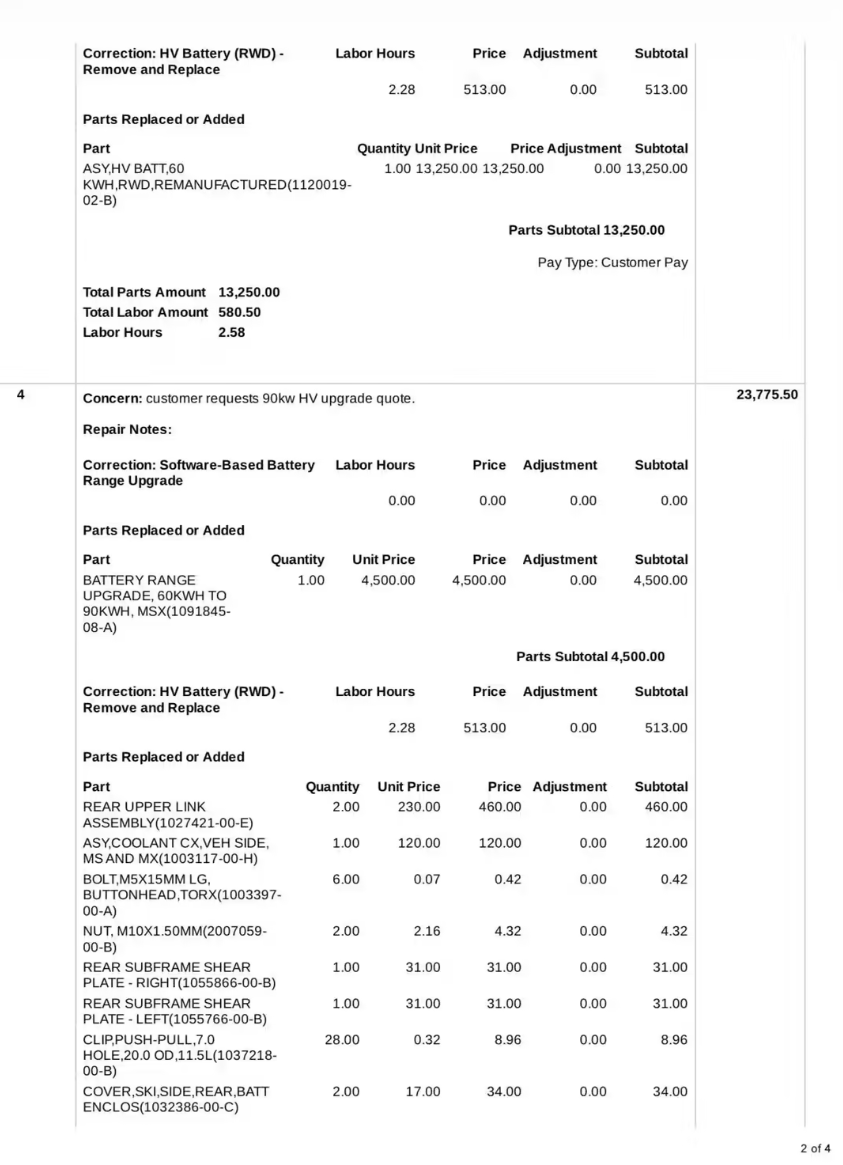 但更换60kWh电池包总价为13830美元(约合人民币96302元),其中人工费580.5美元,电池本体费用13250美元,这一价格对一辆二手车来说并不友好。
