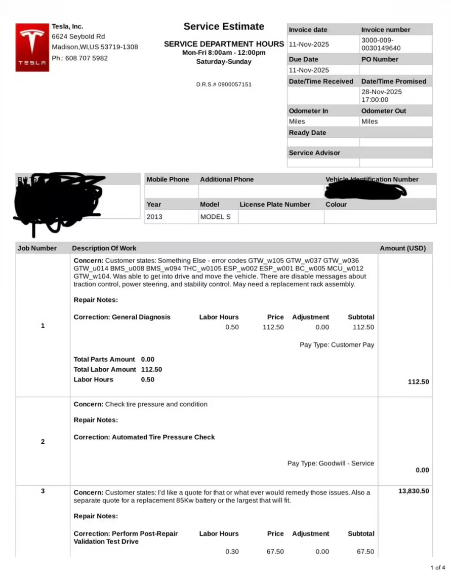 美国一名2013款特斯拉Model S车主在Reddit平台发帖称,自己的车辆电池出现故障后,遭遇了修不起买不掉的尴尬状况。他前往美国威斯康星州麦迪逊特斯拉服务中心去维修,特斯拉提供了更换同款60kWh电池包,或升级为90kWh电池包两种方案。