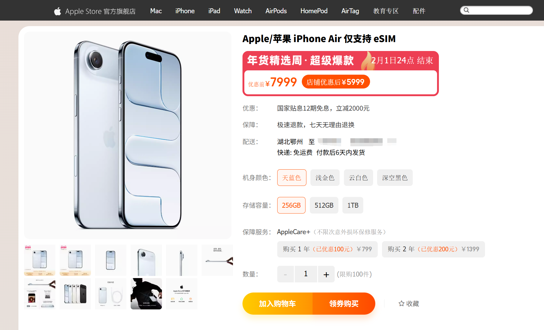 iPhone Air暴降2000元后成真香机:京东已卖断货 发货时间延至2月