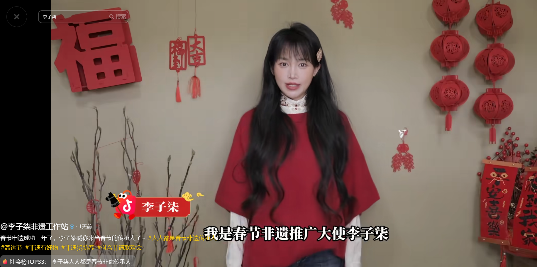 今日,话题“李子柒时隔半年视频露面”微博登上热搜,引发网友热议。据了解,日前,联合国教科文组织发布李子柒最新视频,春节申遗成功一周年之际,李子柒正式成为春节非遗推广大使,并送上新年祝福,号召“每个人都是春节的非遗传承人”。
