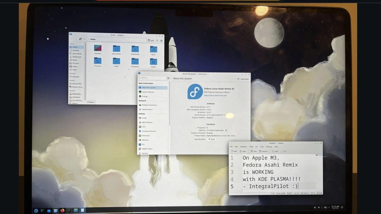 本周一,Asahi Linux 贡献者 IntegralPilot 在 Reddit 上发布了一张照片,显示 Fedora 43 Asahi Remix 已能在搭载 M3 芯片的 Mac 上运行,桌面环境为 KDE Plasma。 他表示,其他用户也已在配备 M3 Pro 与 M3 Max 芯片的机型上成功启动 Linux,不过这些安装都存在重大限制。 目前系统“确实可以启动”,但就终端用户体验而言仍远称不上理想。