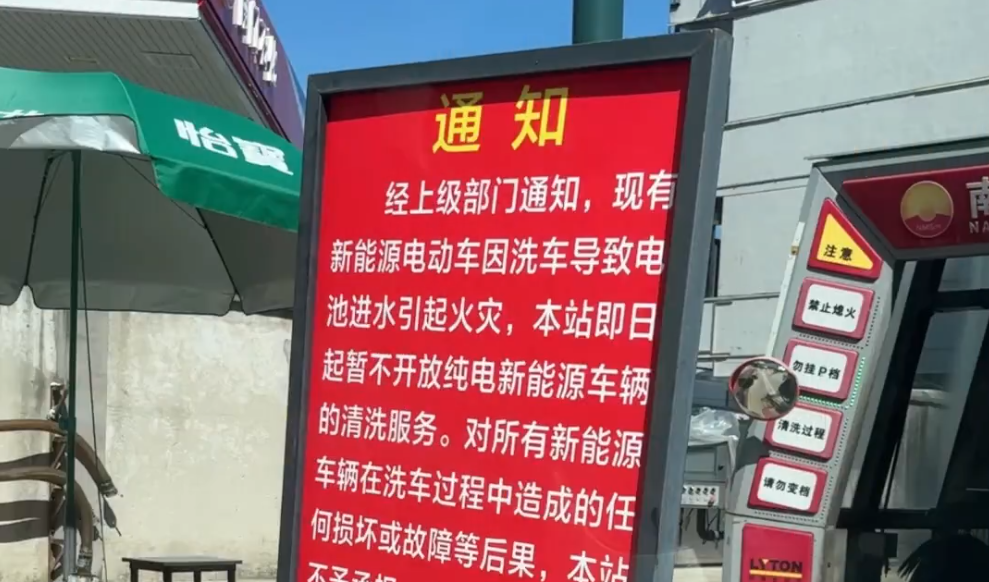 日前,多个网络视频显示,全国多地的加油站纷纷贴出告示,明确拒绝为纯电动汽车提供清洗服务,称高压水流易破坏电池包密封,进而导致进水、短路甚至起火。告示内容表示,经上级部门通知,新能源电动车因洗车导致电池进水引发火灾的情况时有发生,故本站即日起暂不开放纯电新能源车辆清洗服务,且对新能源车辆洗车过程中造成的任何损坏或故障,本站不予承担责任,望车主理解配合。