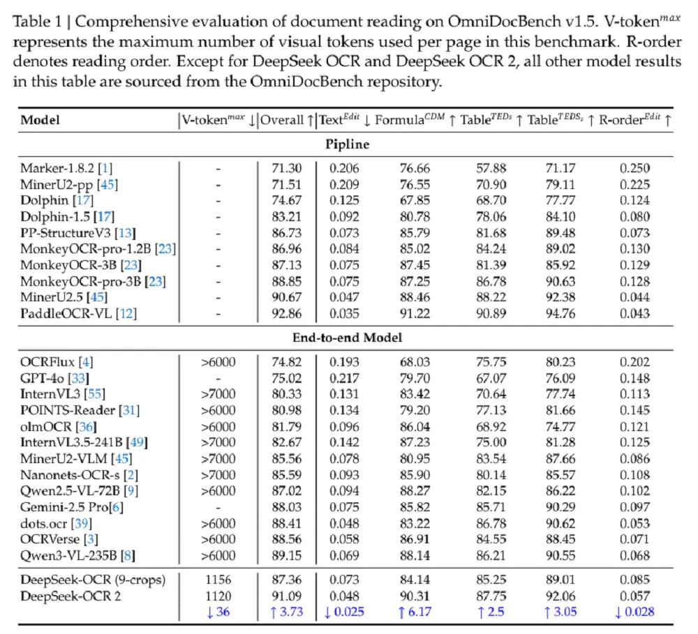 DeepSeek-OCR 2在仅使用最小的视觉标记上限(V-token maxmax)的情况下,达到了91.09%的性能。与DeepSeek-OCR基线相比,在相似的训练数据源下,它表现出3.73%的改进,验证了新架构的有效性。