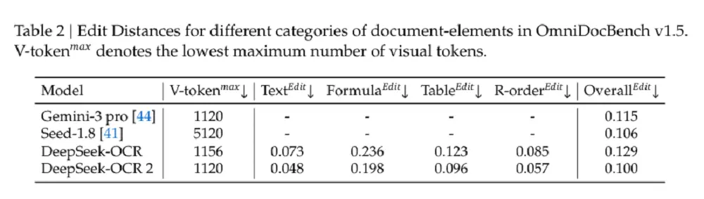 同时,在相似的视觉token预算下,DeepSeek-OCR 2在文档解析方面的编辑距离(编辑为正确文本所需的工作量)低于Gemini-3 Pro,这证明DeepSeek-OCR 2在确保优越性能的同时保持了视觉token的高压缩率。