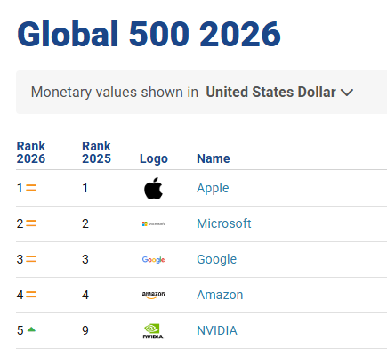 在品牌金融2025年初的品牌价值报告中,特斯拉排第36名,2026年则滑落至第75名。苹果、微软、Google和亚马逊四家稳坐前四,“七巨头”中的英伟达挤进前五,Facebook排第9名。
