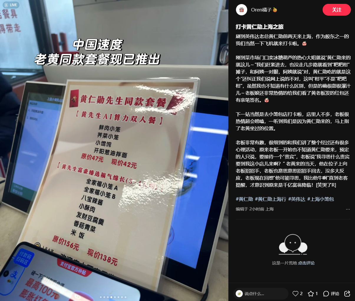 AI教父黄仁勋上海吃小笼包 店家火速推出同款AI算力套餐 42元起