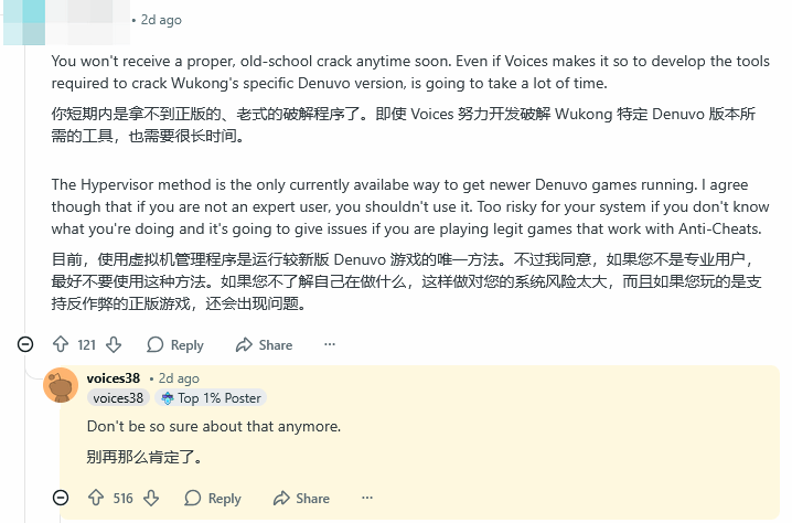 对此,voices38给出了反对的意见:“现在可别再这么确定了。”暗示自己已经掌握了全新的方法,可能在不久之后就能够成功破解《黑神话:悟空》的D加密保护。