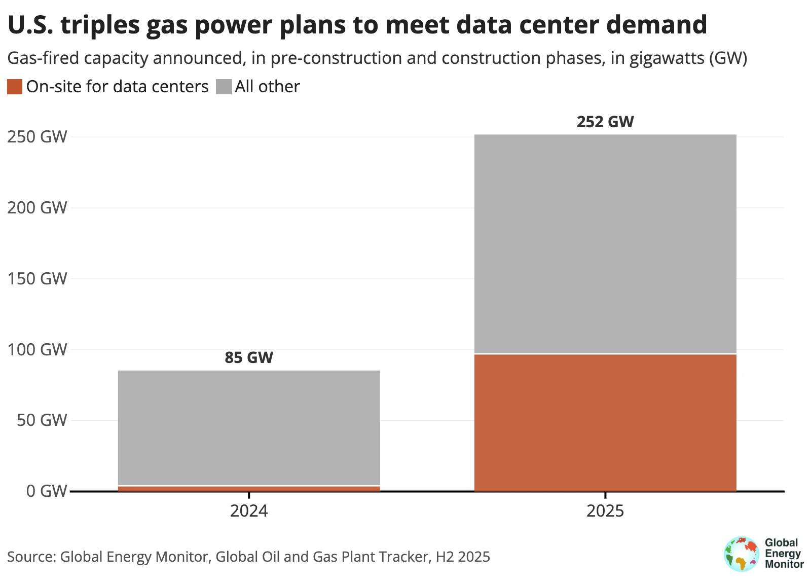 在生成式人工智能浪潮推动下,数据中心的用电需求飙升,正在引发一轮前所未有的燃气发电建设热潮。最新分析显示,2025年全球在建燃气发电项目规模同比增长了31%,其中近四分之一的新增装机容量来自美国,使其在新增燃气发电开发规模上超越中国,跃居全球首位。在美国的新增长中,超过三分之一被预期将直接为数据中心供电。