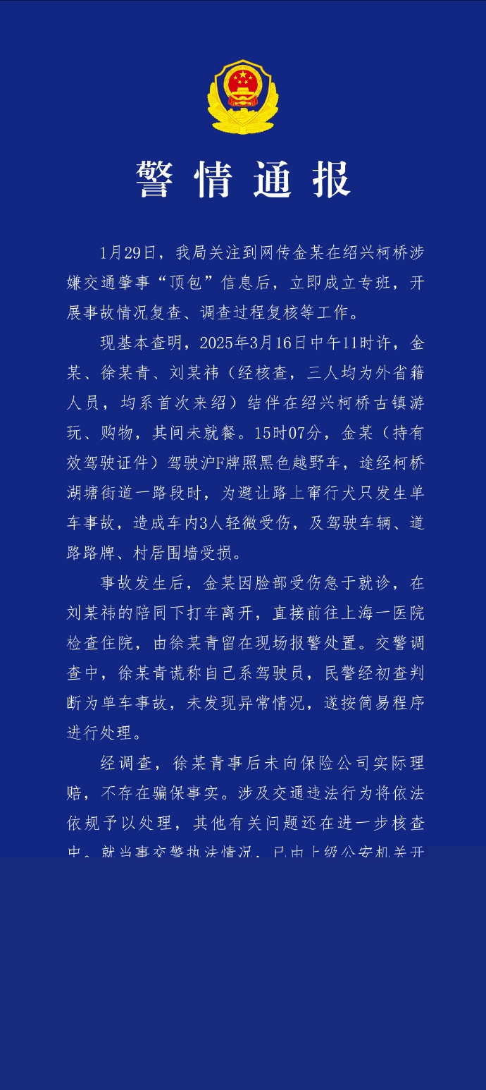 针对女演员金晨肇事逃逸一事,网上传的沸沸扬扬,现在官方给出了具体公告。绍兴市公安局柯桥区分局1月30日通报,现基本查明,2025年3月16日中午11时许,金某、徐某青、刘某祎(经核查,三人均为外省籍人员,均系首次来绍)结伴在绍兴柯桥古镇游玩、购物,其间未就餐。
