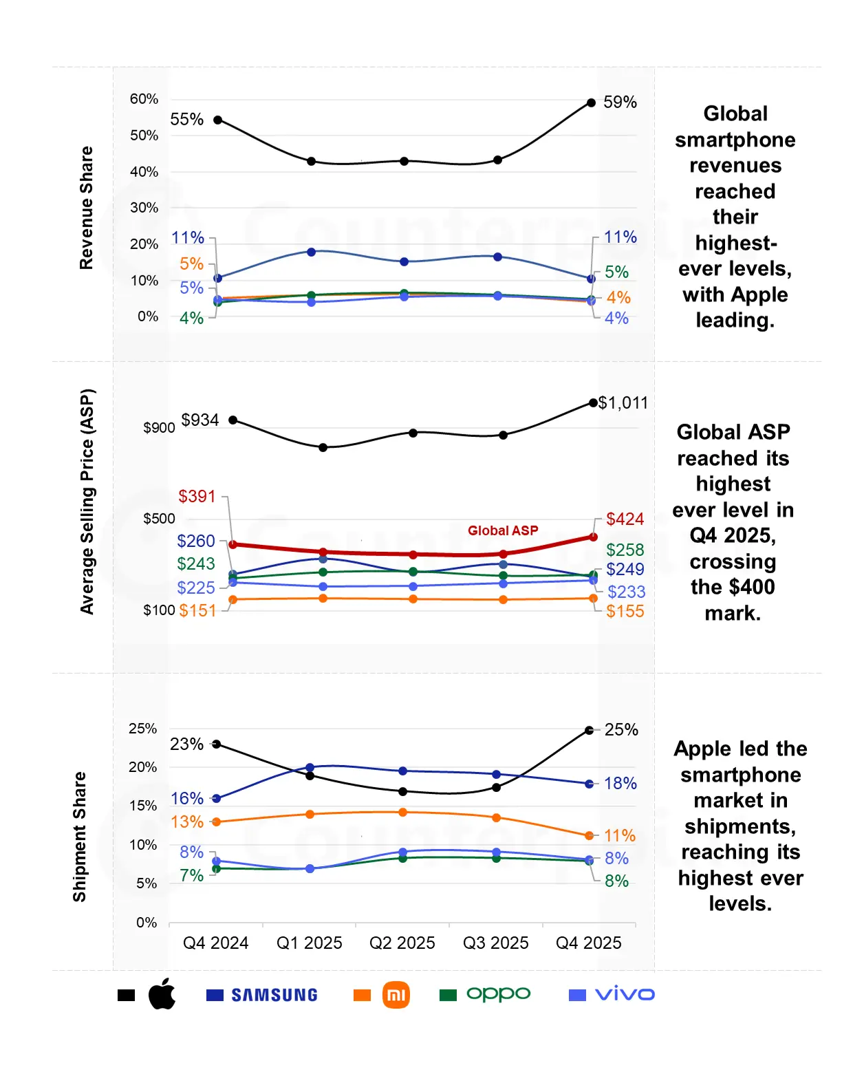 从整体市场来看,全球智能手机在 2025 年第四季度的平均售价也首次突破 400 美元,同比上涨 8%,延续了此前高端化带动 ASP 持续走高的趋势。