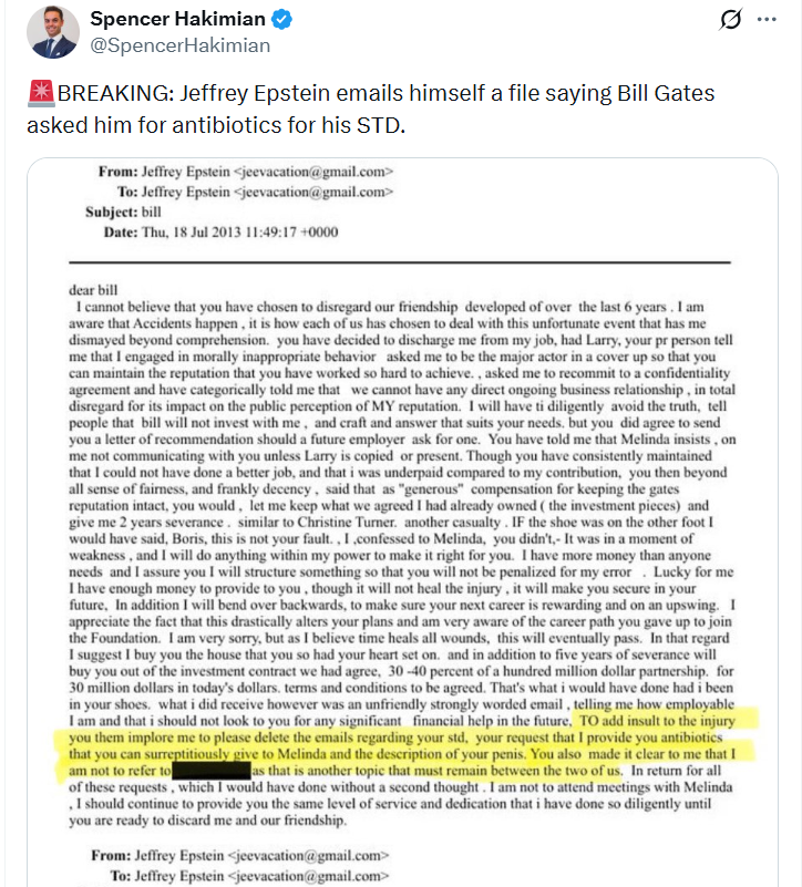 其中,最具爆炸性的内容,来自一封疑似由爱泼斯坦发送给自己的邮件,信中声称,微软创始人比尔·盖茨曾在与俄罗斯女孩发生性关系后,试图隐瞒性病,并请求爱泼斯坦协助提供抗生素,悄悄让妻子服用。