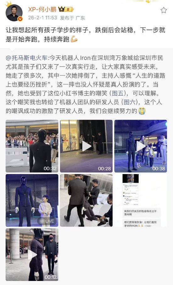 小鹏IRON机器人走路摔倒 何小鹏回应:跌倒后会站稳,下一步就是奔跑