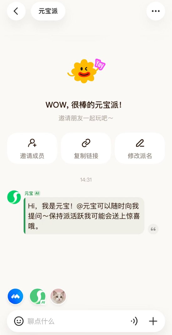 腾讯旗下AI助手元宝,正式宣布“元宝派”公测上线,探索AI社交赛道。据悉,“元宝派”是腾讯全新的AI社交探索,用户可通过元宝App创建或加入一个“派”。在元宝派里,元宝AI作为派友,能够与用户聊天互动、协作与娱乐。