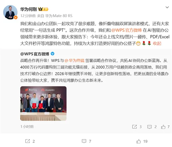 今日,WPS官方微博宣布,与华为终端签署战略合作协议。据悉,双方将共拓AI协同办公新蓝海。“从4000万行代码重构到三端功能无缝衔接,从2000万用户信赖到政企商用落地,我们用技术打破办公边界!2026年继续携手冲刺,让更多创新特性落地,把更丝滑的全场景办公体验带给大家,携手共绘鸿蒙办公生态新未来。 ”