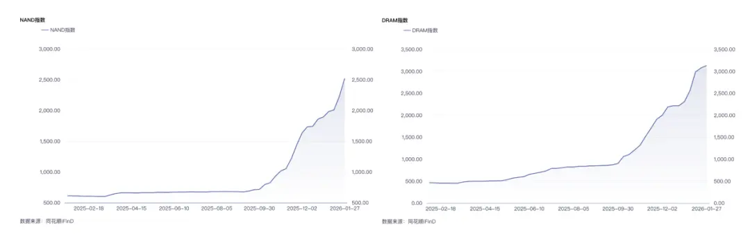 从NAND(闪存)指数和DRAM(内存)指数的变化趋势中,可以清晰地看出,自去年下半年以来,存储元器件的价格便开始一路飙升。如今,在不到半年的时间里,其成本已经翻了数倍。