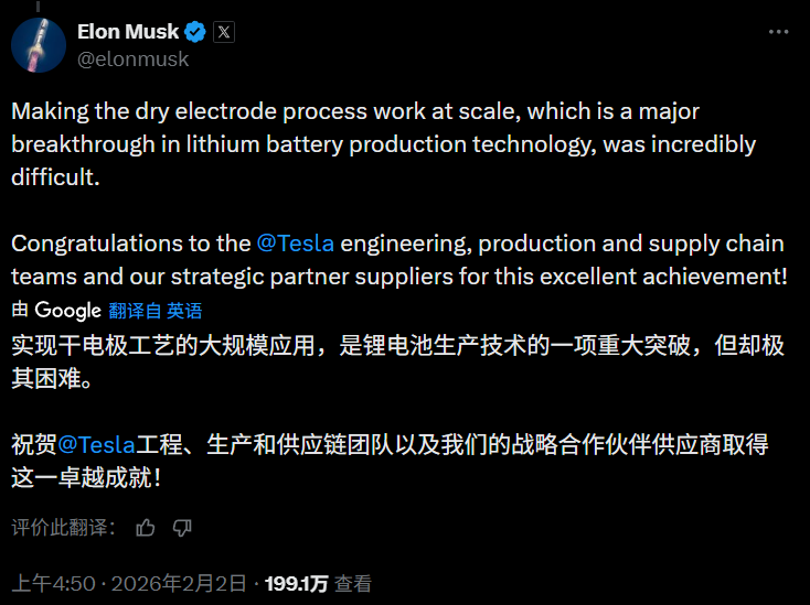 马斯克宣布特斯拉实现干电极电池规模化生产