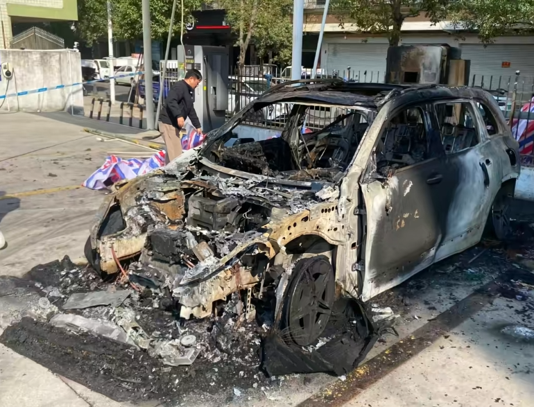 奔驰EQB充电结束后自燃 车辆烧成架子 厂家不回应