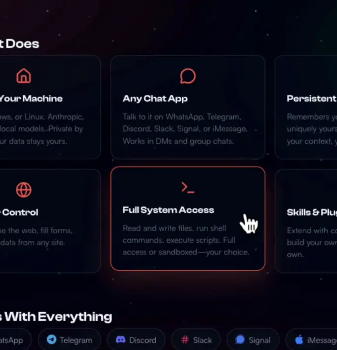 Clawdbot 的不同在于,它直接运行在你的电脑或服务器上,拥有系统级权限。