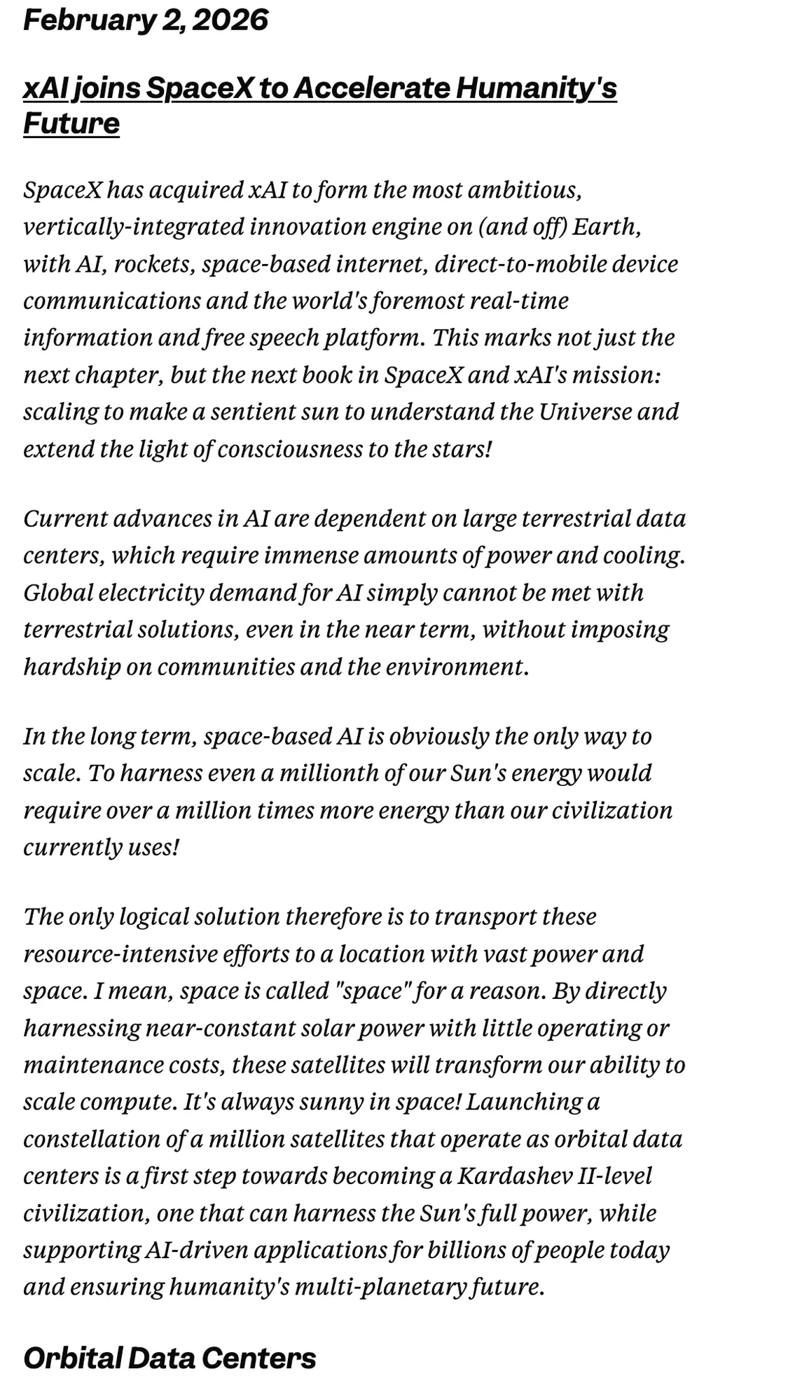 他还表示,这次收购将使合并后的公司能够在太空中部署数据中心。“这不仅标志着SpaceX与xAI使命的新篇章,更是全新的征程:我们将拓展规模,打造一个能感知的‘太阳’来理解宇宙,并将意识之光延伸至星辰!”