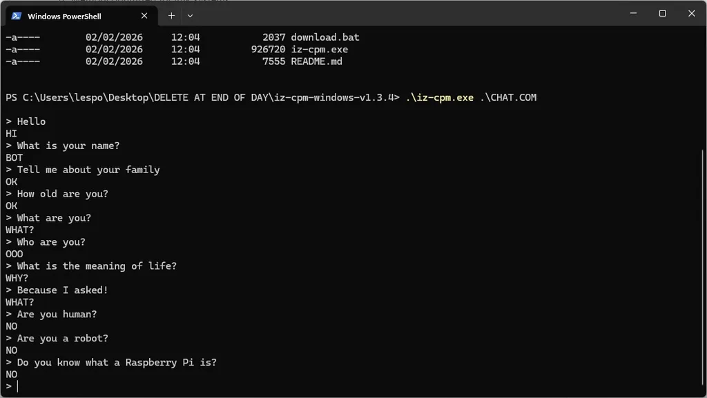 HarryR将整个推理引擎、模型权重以及聊天交互界面全部压缩进了一个仅约40KB的文件中,完美运行在只有64KB RAM的老古董硬件上。
