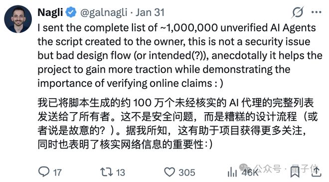 这之后,他又完整扫描了一遍Moltbook的用户名单,发现约有100万个Agent的身份都无法核实