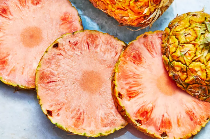 粉菠萝采用转基因技术降低了中间转化酶的水平,在成熟后仍然含有较多的番茄红素,果肉的颜色就与众不同了。2016 年,美国食品药品监督管理局(FDA)认定粉菠萝可以安全食用并批准上市。