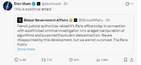 法国司法部门搜查X巴黎办公室 马斯克称这是“政治攻击”