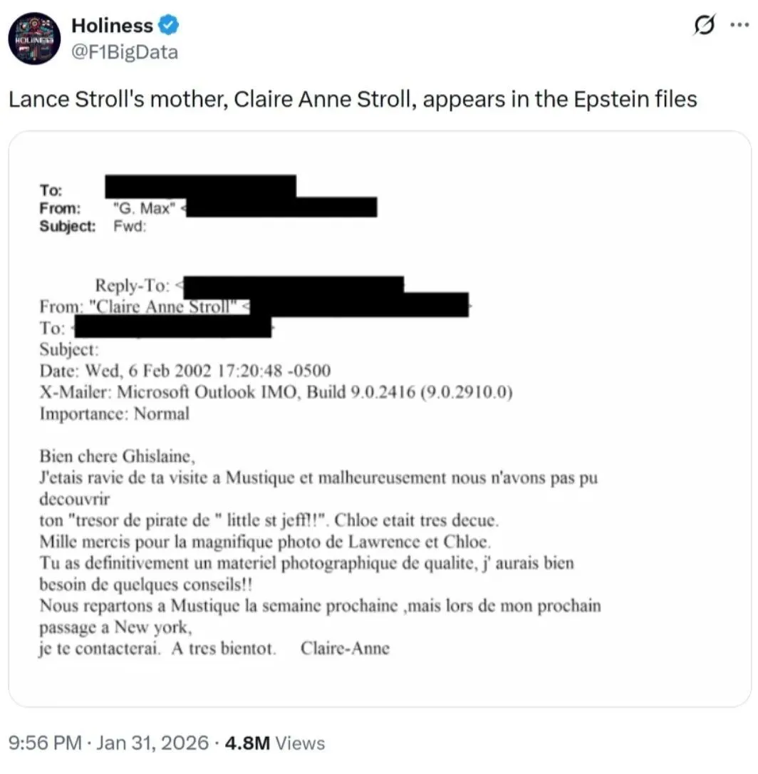 该帖指出,在最新公开的爱泼斯坦案相关文件中,F1 阿斯顿·马丁车队老板劳伦斯·斯托罗尔(Lawrence Stroll)的妻子 Claire Anne Stroll 的名字被提及。