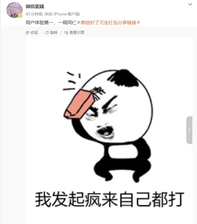 2月4日,微信公关总监“微信粥姨”发文回应“微信封了元宝红包分享链接”:称用户体验第一,一视同仁。还附上了一张“我发起疯来自己都打”的表情图。