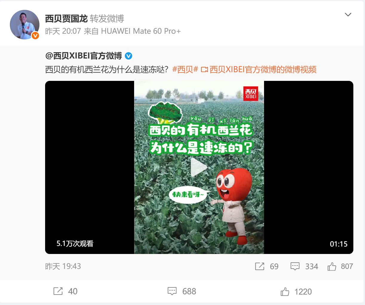 昨日,西贝创始人贾国龙的微博账号解禁。贾国龙解禁后的第一条内容是“西贝有机西兰花为什么是速冻”的科普视频。而该视频转发自“西贝XIBEI”官方微博。