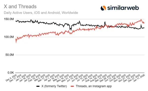 马斯克终究还是把X玩砸了?是这样的,前不久市场调研机构 Similarweb 发了份报告,显示 Meta 旗下的社交媒体平台 Threads 在移动端的 DAU 已经超过了 X (原Twitter)。截至2026 年1月7日,移动端 Threads 的 DAU 已经达到了 1.415 亿,而 X 的 DAU 是 1.25 亿。