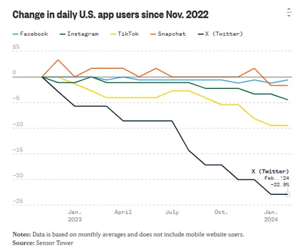 被马斯克收购之后的一年多时间里, X 在美国的每日活跃用户数量下降了 23% ,几乎断崖式下跌的日活,是几家平台里面跌得最狠的。(数据截至 2024 年 2 月)