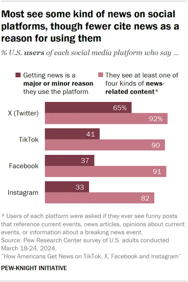 根据皮尤研究所的一份报告,大多数 X 用户表示,获取新闻资讯是他们使用该平台的主要或次要原因,约有一半的用户表示,他们经常在 X 上获取新闻。