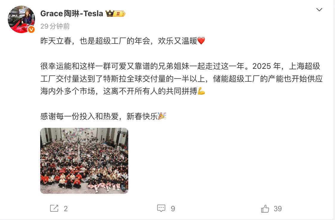 2月5日,特斯拉公司副总裁陶琳发文表示,2025年,上海超级工厂交付量达到了特斯拉全球交付量的一半以上,储能超级工厂的产能也开始供应海内外多个市场,这离不开所有人的共同拼搏。