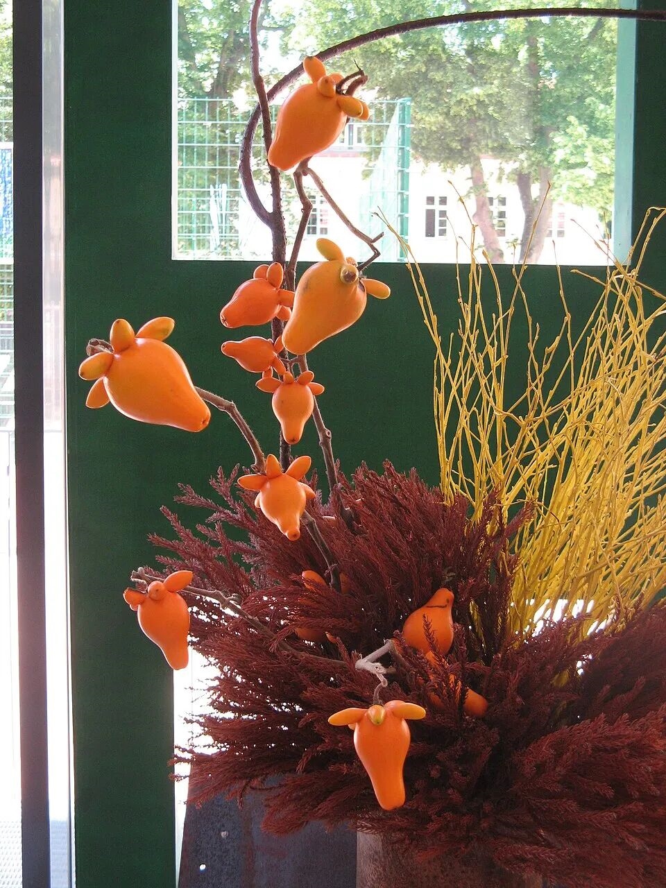 原来,用来出售的观赏乳茄都是商家提前将果实剪下来,固定在底座上做出造型,再插上其它植物的绿叶做出来的。