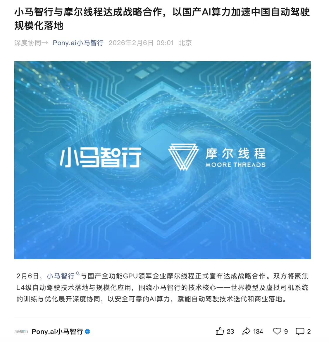 小马智行与摩尔线程达成战略合作 国产全功能GPU进入自动驾驶核心领域