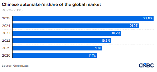 在此之前,中国车企已在南美、印度、墨西哥等低收入、汽车产业尚不成熟的地区实现快速发展,而这些地区历来都是美国车企的增长型市场。据德国汽车数据研究公司 Dataforce 统计,中国车企也成功打入欧洲市场,其在欧洲的汽车销量占比从 2020 年的几乎为零,升至 2025 年 12 月的近 10%。