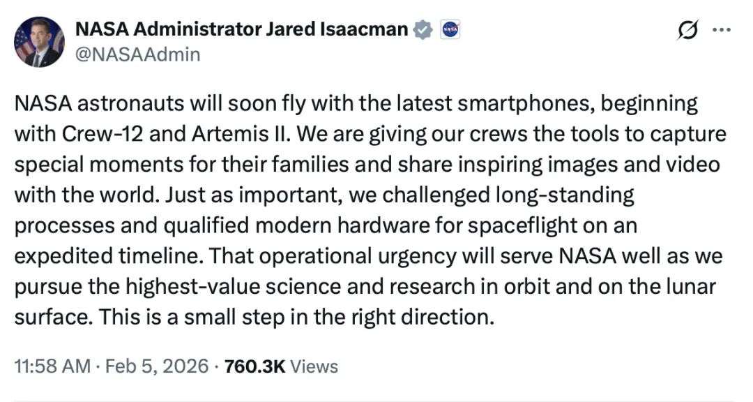就在本周,NASA新任局长贾里德·艾萨克曼(Jared Isaacman)在社交平台X上宣布了一项令果粉和航天迷共同振奋的消息。从即将来临的Crew-12载人任务和阿尔忒弥斯2号(Artemis II)绕月飞行任务开始,宇航员将被允许携带iPhone及其他现代智能手机进入太空轨道,甚至前往月球。