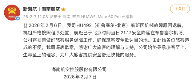 2月6日,我司HU492(布鲁塞尔-北京)航班因机械故障原因返航,机组严格按照程序处置,航班已于北京时间当日21:17安全降落在布鲁塞尔机场。公司将妥善做好旅客服务保障工作,确保旅客安全抵达目的地。