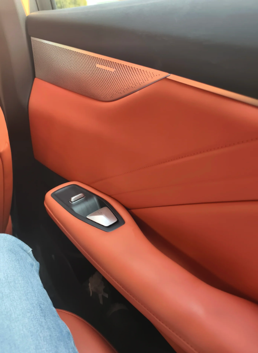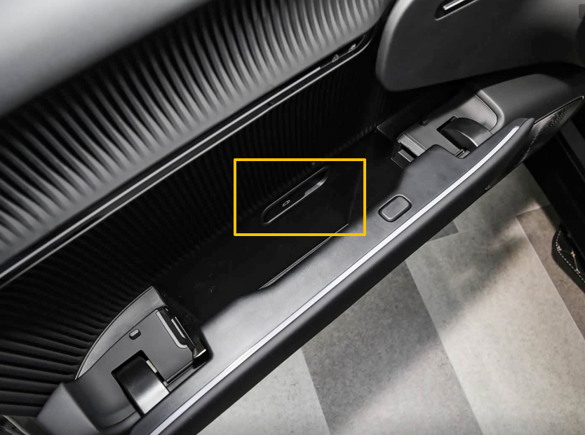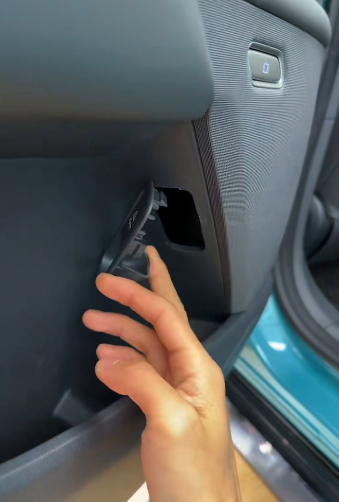还是拿特斯拉举例吧,Model Y 的前排是一个电控 + 机械的扳手,但是到了后排,机械拉手不翻说明书你都找不到。