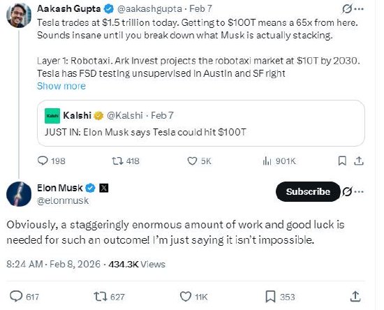 马斯克称特斯拉市值达到100万亿美元并非不可能