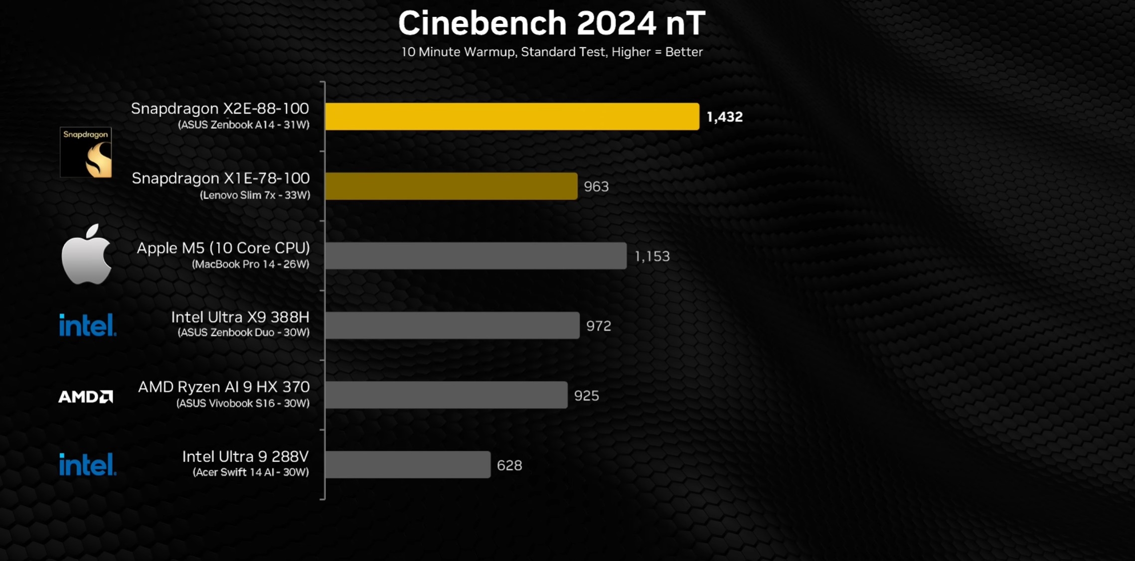 骁龙X2 Elite - 1432(比M5快24.2%,比骁龙X Elite快48.7%)