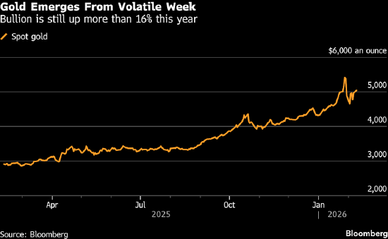 贵金属市场经历了波动剧烈的一周后,逢低买盘重返市场,推动黄金价格攀升至每盎司5000美元上方。黄金价格周一涨幅最高达1.7%,在上月末遭遇历史性暴跌后进一步收复部分失地,目前已回补1月29日创下历史新高后产生的约半数跌幅。白银价格同样走高。