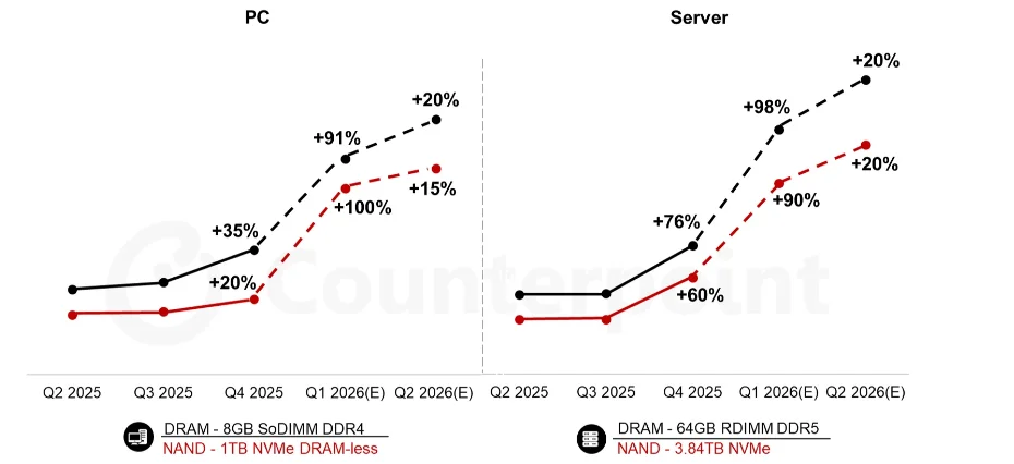 内存价格飙车已经止不住了,哪怕是猛涨了半年之后的现在,价格依然在保持几乎翻倍的水平上涨,今年Q1季度价格环比再涨多达90%。来自调研机构Counterpoint发布的内存价格追踪数据显示,2026年的Q1季度虽然才过了一半左右,但内存价格环比飙涨了80%到90%,涨幅创造了新纪录。