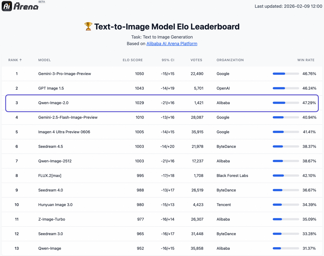 今日,阿里巴巴正式发布新一代图像生成及编辑模型Qwen-Image-2.0。作为千问大模型的图像生成模型底座,Qwen-Image-2.0集生图和编辑于一体,在AI Arena文生图评测中斩获1029分,超过Seedream4.5、Flux2-Max等模型,仅次于谷歌Nano Banana Pro和GPT Image1.5。