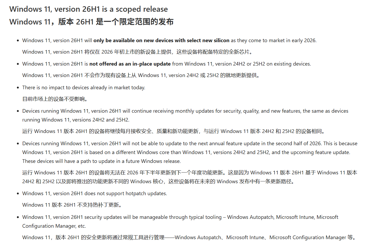 但微软承诺未来版本将提供统一升级路径,具体是27H1或其他版本尚待确认,另外Windows 11 26H1每月可以获得安全和质量更新,但不支持热补丁技术。