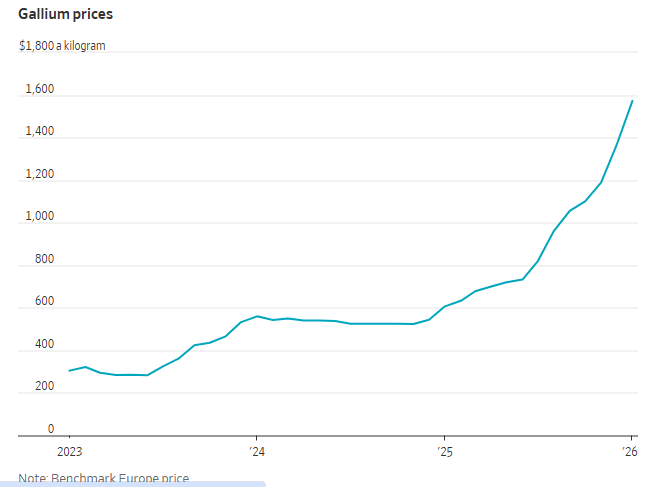 镓是一种奇特的银白色金属,熔点低到能在手掌中融化。而在过去两年,国际市场上镓价的涨势,也几乎轻而易举就“燃烧”到了沸点。行情数据显示,过去两年间,国际基准的鹿特丹低纯度镓价已上涨了近三倍。根据Argus Media的数据,今年1月平均价格创下每公斤约1572美元的历史新高。