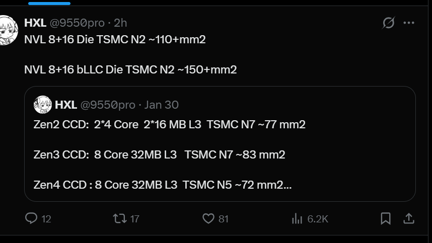 Nova Lake要竞争的对手是AMD今年的Zen6家族,此前HXL也曝光了Zen6的核心面积,同样是台积电2nm工艺,Zen6的CCD是升级到了12核架构,核心面积从上代8核架构的71mm2增加到了76mm2,只增加了5mm2面积,效率非常高。